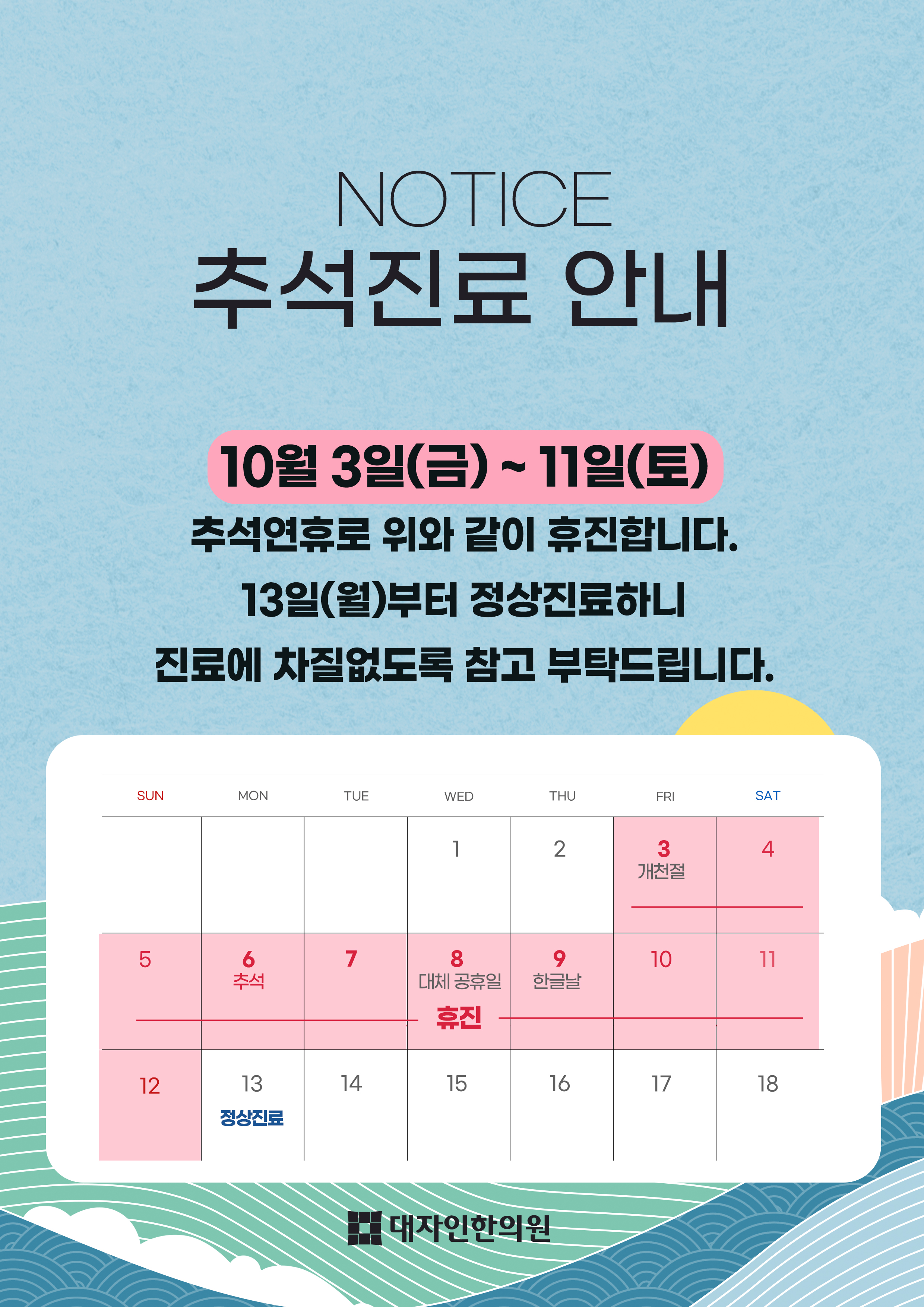 추석 연휴로 10월 3일(금) ~ 11일(토)까지 휴진하니